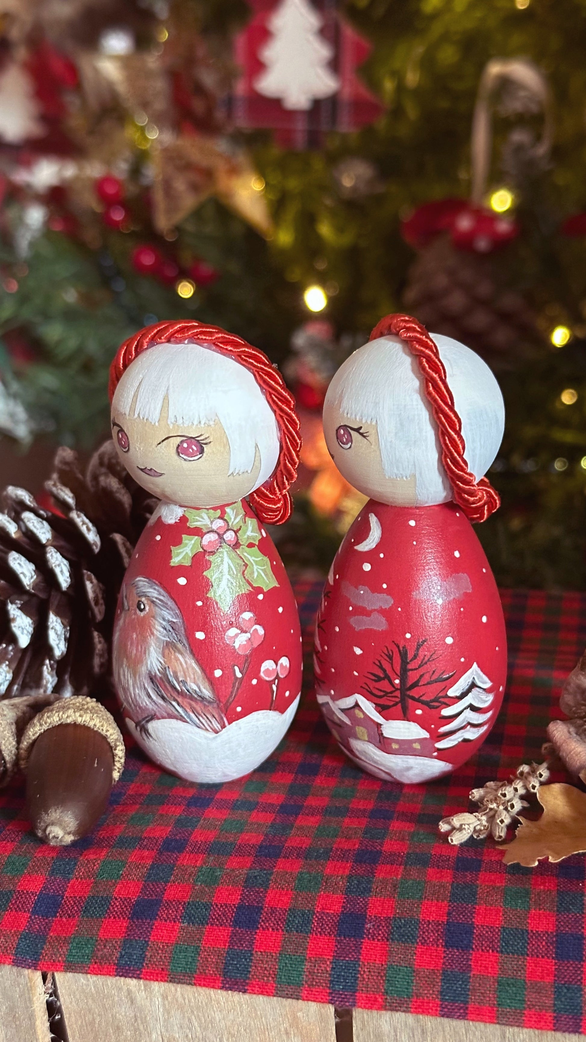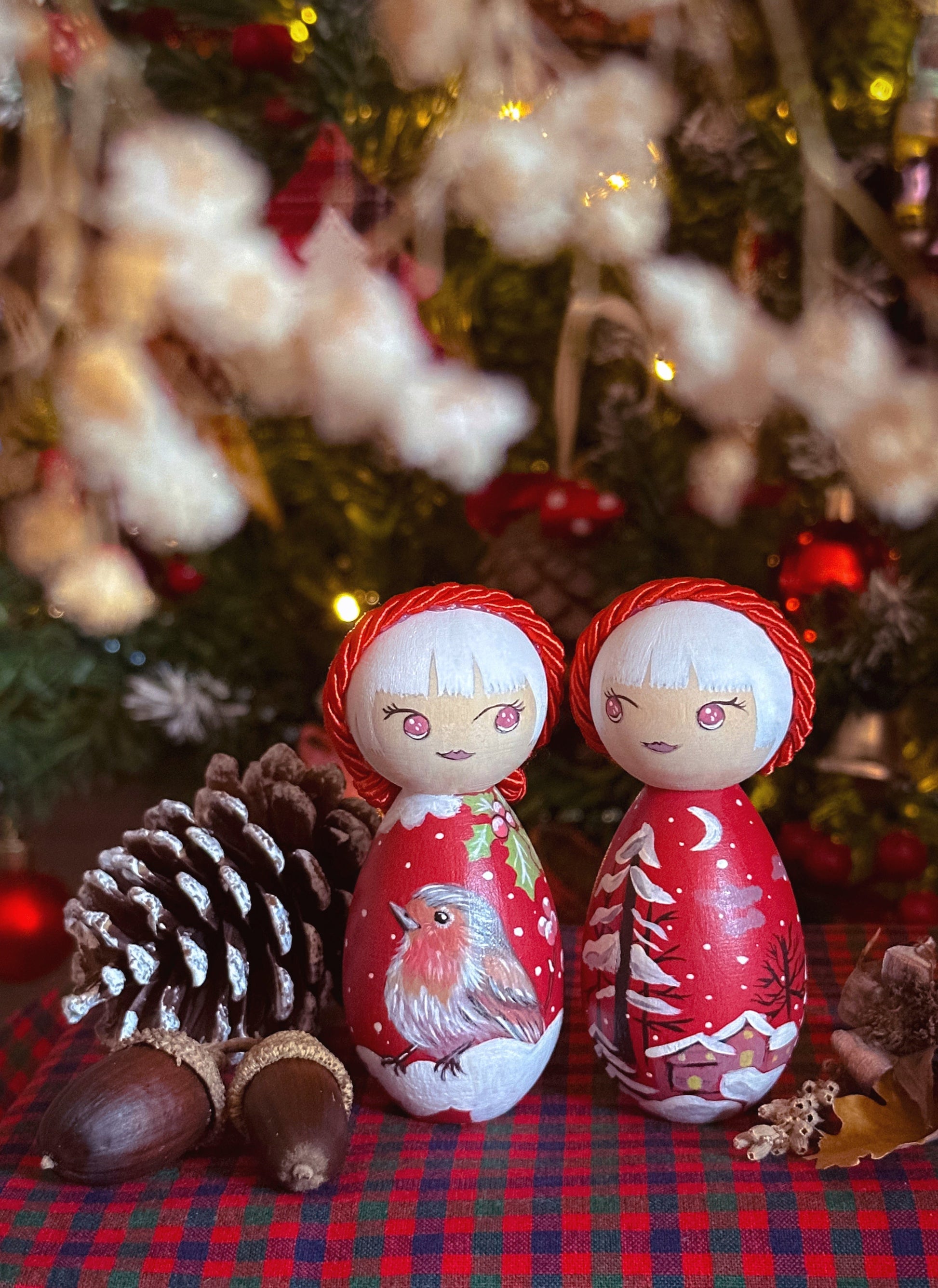 Le Kokeshine Natalizie "Sogno - 夢 Yume", nascono grazie a due vecchi lavori che dipinsi nell'ormai lontano 2020, due decori per l'albero di Natale, a forma di cuore, con dipinti i due soggetti che ho voluto replicare tali e quali sulle mie Kokeshine!